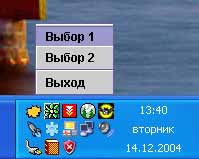 Как видно из исходного кода нашего примера, сначала мы получаем объект системного трея. После этого в самом начале конструктора мы создаем всплывающее меню JMenuPopup с тремя элементами и одни разделителем. На последний элемент quit мы вешаем слушатель событий ActionListener, чтобы можно было выйти. Теперь вместо добавления созданного нами меню в строку меню или какой-нибудь объект JComponent, мы передаем его конструктору TrayIcon. ImageIcon, который играет роль иконки для системного трея, также передается конструктору TrayIcon вместе с текстом tooltip’ом. В завершение мы добавляем наш объект TrayIcon в SystemTray. Скомпилируйте этот пример с файлом tray.jar в CLASSPATH и tray.dll (для Windows), находящимся в директории библиотек (-Djava.library.path=<путь к директории>).