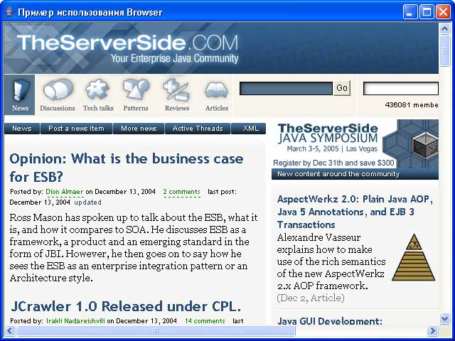 В нашем примере, с помощью JDIC, мы используем браузер выбранный по умолчанию пользователем, обычно это либо Internet Explorer, либо Mozilla. При этом вам совсем не нужно упаковывать части Mozilla вместе со своим приложением, как вам нужно было бы, если бы вы использовали JRex (http://jrex.mozilla.org/). Такой подход, т.е. с использованием JDIC, идеально подходит для операционных систем семейства Windows, поскольку на них гарантированно присутствует Internet Explorer. Однако с Linux могут возникнуть проблемы, где браузером по умолчанию может быть не Mozilla, а Konquorer в KDE, например. Вероятно все будет значительно лучше в более зрелых релизах проекта JDIC, но несмотря ни на что, на данный момент возможности компонента Browser окажут неоценимую помощь многим проектам и приложениям.