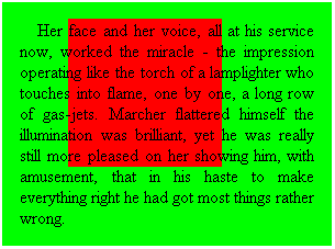 <div style="clip: rect(15px, 200px, 150px, 60px); background: #ff0000;"> Her face and her voice, all at his service now, worked the miracle - the impression operating like the torch of a lamplighter who touches into flame, one by one, a long row of gas-jets. Marcher flattered himself the illumination was brilliant, yet he was really still more pleased on her showing him, with amusement, that in his haste to make everything right he had got most things rather wrong.</div>