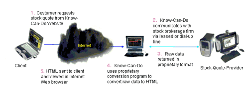 Например, предположим, что компания “Know-Can-Do” на своем Web-сайте предлагала информацию о курсе акций. Для этого ей необходимо было получить первичные данные от их поставщика, скажем, компании “Stock-Quote-Provider”. Компания “Know-Can-Do” в типичном случае получала данные от “Stock-Quote-Provider” с помощью некой специально разработанной технологии (например, специально установленного программного обеспечения), а также дорогостоящих аппаратных средств (например, выделенной линии). Более того, “Know-Can-Do” приходилось создавать приложения для преобразования первичных данных в HTML. Этот процесс проиллюстрирован на рисунке 1. Обратите внимание на светло-голубую линию, которая обозначает взаимодействие между “Know-Can-Do” и “Stock-Quote-Provider”; используемая для этого взаимодействия технология весьма дорога, так как специально создана для данной системы.