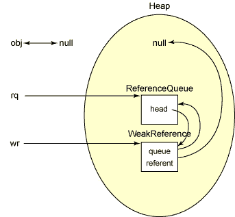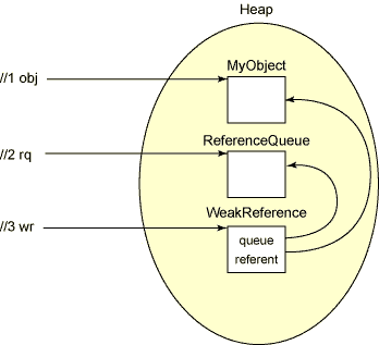 //Создает прямую ссылку на объект MyObject obj = new MyObject(); //1 //Создает reference queue ReferenceQueue rq = new ReferenceQueue(); //2 //Создает weakReference к obj и соответствующий наш reference queue WeakReference wr = new WeakReference(obj, rq); //3