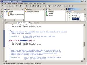 CalcPanel.java представляет основу интерфейса пользователя нашего калькулятора. Calculator.java выполняет подготовительные инициализационные функции и запускает GUI (графический интерфейс пользователя). Самая же важная часть нашей программы находится в файле CalcModel.java, который занимается непосредственно реализацией фактической математики нашего калькулятора: реагирование на события, выполнение математических вычислений, обновление отображаемой информации, и т.д. Самый простой способ просмотреть исходный код – это переключиться из ракурса Java в Java Browsing. Для этого используйте Open Perspetive из меню Window или кликните на кнопке Open, которая находится на панели инструментов для работы с ракурсами.