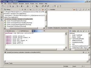 Создав однажды конфигурацию запуска своего приложения, вы можете запускать его вновь с помощью меню Run->Run History или кнопки Run на панели инструментов. Если вы потратите достаточно времени, "играя" с этим калькулятором, вы обнаружите, что он работает в основном правильно, но только с одном "но": он не хочет правильно выполнять операцию вычитания! Время пустить в ход отладчик исходного кода Eclipse и обнаружить эту злосчастную ошибку. Если вы следовали всем инструкциям, приведенным выше в этой статье, то вы можете запустить это приложение с отладчиком с той же конфигурацией, которую мы определили для обычного запуска. Для этого выберите в меню пункт Run->Debug History->Calculator.