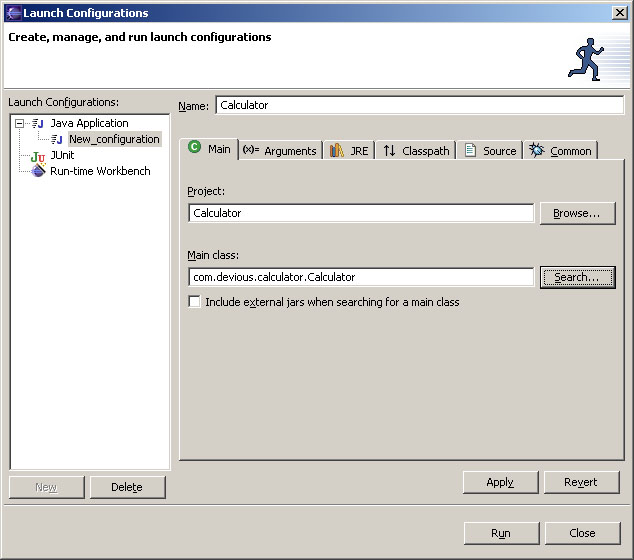 4. Нажмите кнопку Search... и выберите основным классом класс Calculator в поле Main class, или просто введите в поле ввода полное имя класса: com.devious.calculator.Calculator.