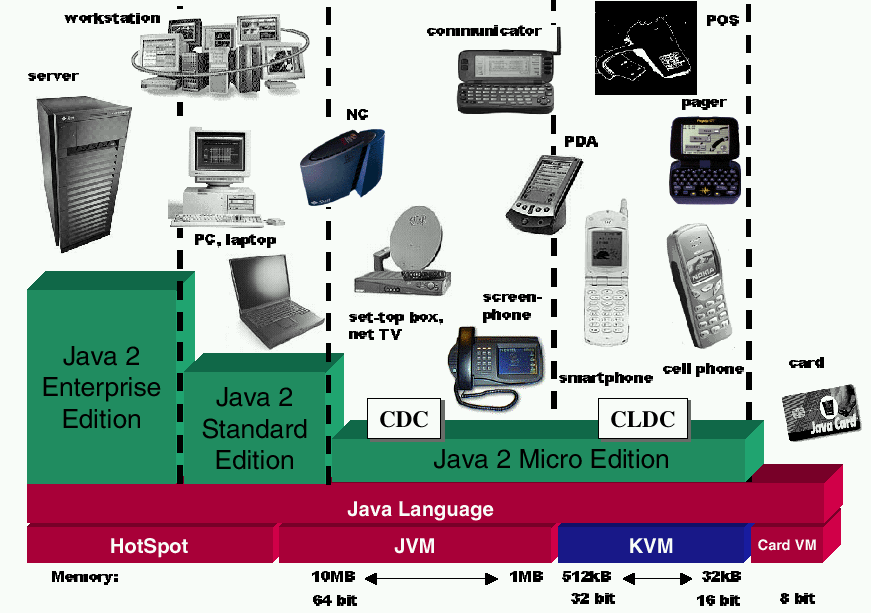 - Для CLDC была разработана своя JVM, в реализации Sun она называется KVM (Kilo VM). Она не имеет операций с плавающей точкой, не допускает финализаторов у классов, не реализует JNI, не допускает использования пользовательских загрузчиков классов, имеет очень слабые Security механизмы, не имеет механизма Reflection и еще много чего. Но зато она имеет очень малый размер – несколько сотен килобайт, что позволяет уместить такую виртуальную машину, например, в мобильный телефон с очень небольшим количеством памяти;