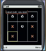 После завершения обхода ставим нолик в последней запомнившейся комбинации с наивысшим приоритетом. Логика сделана с тем расчетом, чтобы при желании ее можно было использовать в более сложной игре Go. Класс Fields отвечает за рисование игрового поля и содержит экземпляр класса Engine. Класс MyCanvas отвечает за перехват событий клавиатуры и меню, всю логику прорисовки экрана он делегирует экземпляру класса Fields. Вот так выглядит запущенное приложение на эмуляторе из состава J2ME Wireless Toolkit.