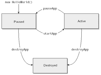 startApp, pauseApp, и destroyApp. Эти три метода и определяет жизненый цикл нашего мидлета.