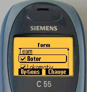 ... ChoiceGroup choiceGroup; private void showTeamList() { Form form = new Form ("Form"); choiceGroup = new ChoiceGroup ("Team", Choice.MULTIPLE); choiceGroup.append ("Rotor", null); choiceGroup.append ("Lokomotiv", null); choiceGroup.append ("Zenit", null); form.append (choiceGroup); form.addCommand (backCommand); form.addCommand (okCommand); form.setItemStateListener (this); form.setCommandListener (this); display.setCurrent (form); } public void itemStateChanged ( javax.microedition.lcdui.Item item) { if (item == choiceGroup) { for (int i = 0; i < choiceGroup.size(); i++) { System.err.println (i + " = " + choiceGroup.isSelected (i)); } } } ...