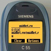 ... Form form = new Form ("midlet.ru"); TextField textField = new TextField ("e-mail","[email protected]",32,TextField.EMAILADDR); form.append (textField); form.addCommand (backCommand); form.addCommand (okCommand); form.setCommandListener (this); display.setCurrent (form); ...