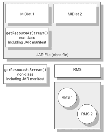 - Все остальные файлы (не класс файлы) в пределах jar файла (в пределах MIDlet suite). Данные файлы могут быть доступны через java.lang.Class.getResourceAsStream метод. (Содержимое JAD файла и манифеста доступно через javax.microedition.midlet.MIDlet.getAppProperty метод.)