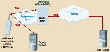 Эти запросы передаются по беспроводной сети к специальному шлюзовому устройству, которое не только осуществляет информационный обмен между беспроводной и проводной частями сети, но и трансформирует WML-запросы в HTML-запросы и отправляет их к Web-серверу. При передаче обратного трафика шлюз также осуществлет преобразование информации из одного формата в другой.